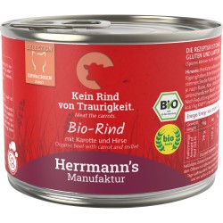 Herrmann Selection ist ein Alleinfuttermittel, ohne Tierversuche, mit nur einer tierischen Proteinquelle, kalt abgefüllt, bei schoneneder Temperatur erhitzt, frei von Zusätzen wie künstlichen Vitaminen, Füllstoffen, Bindemitteln oder Tiermehlen. Die Herrmann’s Manufaktur überzeugt mit hochwertigem Haustierfutter in zertifizierter Bio-Qualität aus nachhaltiger Produktion in Deutschland. Für die Menüs werdenausschließlich Zutaten aus kontrolliertem biologischen Anbau sowie artgerechter Tierhaltungverwendet.